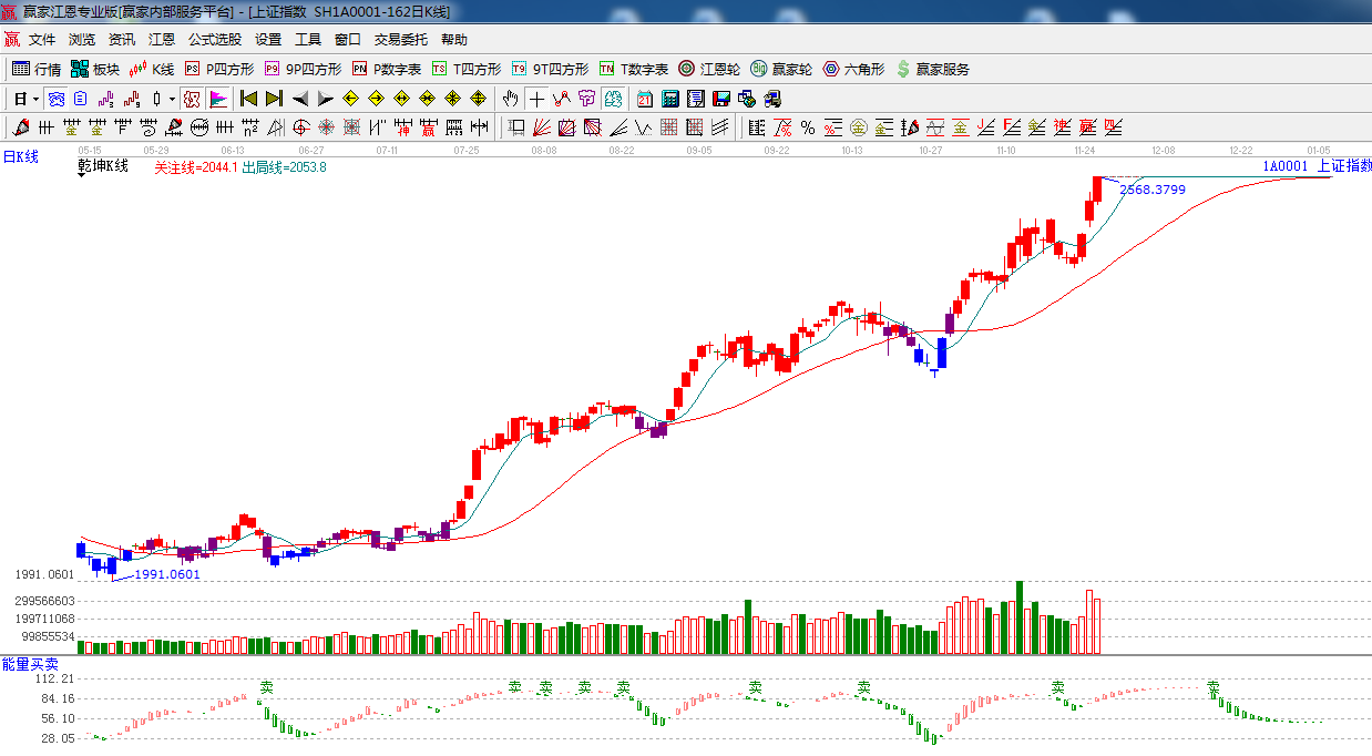 ★依據(jù)贏家江恩系統(tǒng)乾坤K線提示:紅色區(qū)域,短線出局線之上,看多。