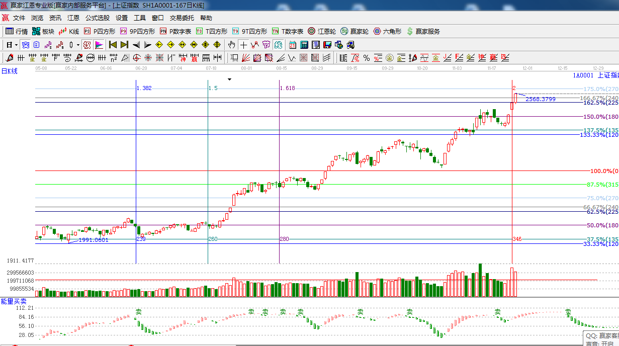 ☆依據(jù)贏家江恩系統(tǒng)波段百分比提示:延續(xù)周一強(qiáng)勢(shì),突破2550點(diǎn),此位置轉(zhuǎn)變位支撐,上方270度2585點(diǎn)。