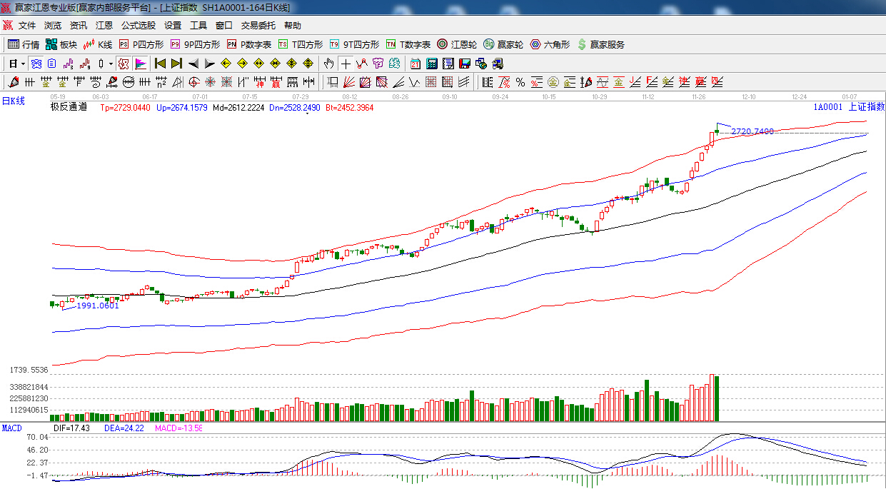 江恩看盤綜述:依據(jù)贏家江恩技術工具分析得出:上證在200%位置沖高回落,陰十字星報收,量能依然保持高水平,明日關注200%,2692點的爭奪,線上看多,線下看空,預計本周指數(shù)整體以高位震蕩為主,操作上,一線藍籌切莫追漲,可適當關注低位具有估值優(yōu)勢的板塊和個股