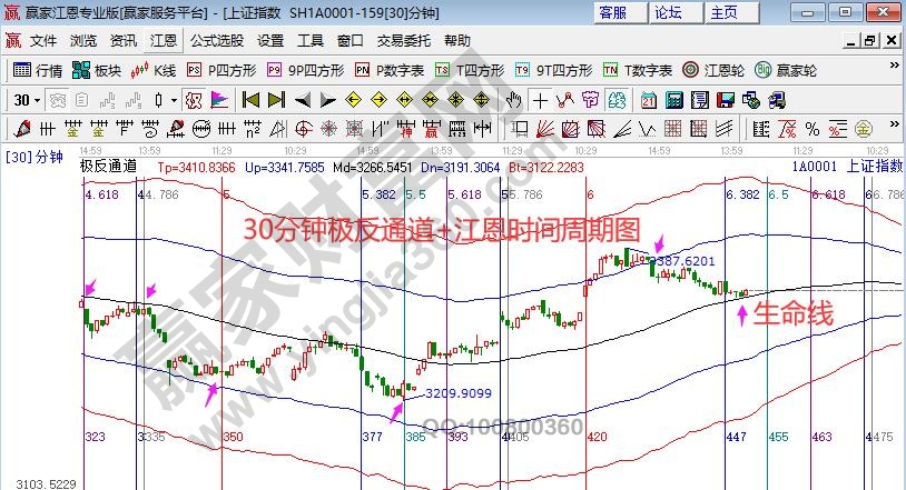 10號創(chuàng)階段高點后,經(jīng)過三天的空間修整,短周期30分鐘到達(dá)極反通道生命線支撐位,表明市場13號盤中有反彈動作,空間高度按周期關(guān)系推導(dǎo)先看15分鐘生命線。日線方面,目前K線在生命線3300點與江恩箱4*1線3321點支撐區(qū)間上運行,但配合時間周期,更安全的時空買點在5倍時間。當(dāng)前應(yīng)對思路是支撐區(qū)間上運行激進(jìn)者可繼續(xù)操作,穩(wěn)健者等待時間窗口后機會。13號支撐3321、3326;阻力3358、3368。
