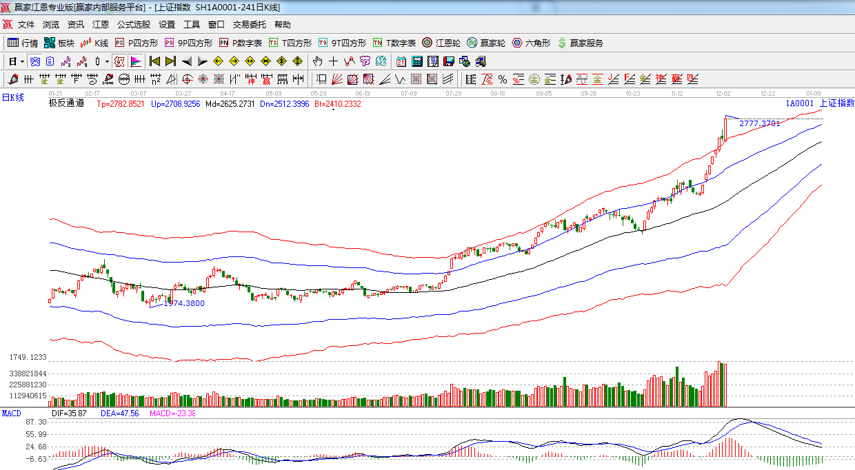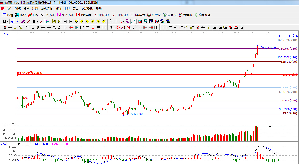 江恩看盤綜述:依據(jù)贏家江恩技術(shù)工具分析得出:市場自12月24日窗口降息以來,在金融權(quán)重的帶動下強(qiáng)勢上攻,今日強(qiáng)勢突破江恩180度2743點(diǎn),此位置轉(zhuǎn)換為支撐,明日此位置回踩不破,下一目標(biāo)位將是240度位置2842點(diǎn),操作上,可適當(dāng)逢低關(guān)注空氣治理、污水處理等概念股,尤其是具備高送轉(zhuǎn)預(yù)期的個(gè)股。