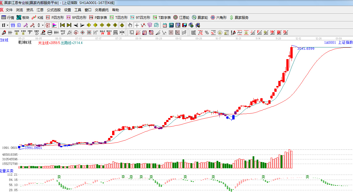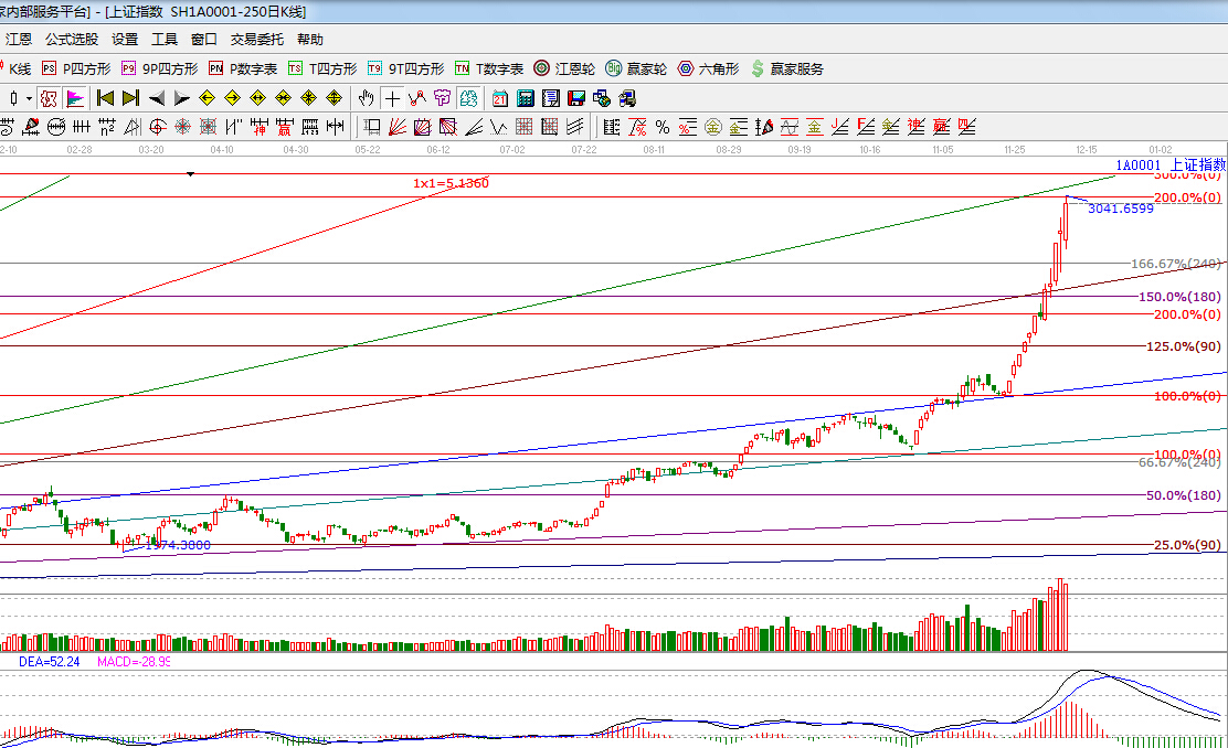 江恩看盤綜述:依據(jù)贏家江恩技術(shù)工具分析得出:指數(shù)繼續(xù)放量拉升,最高3041點,收盤3020點,量能保持強勢,對于指數(shù)而言,短線不排除還有可能震蕩創(chuàng)新高,但上方將面臨強阻力區(qū)間3038點—3111點,所以后半周短線震蕩或加劇,操作上,適當(dāng)拋售漲幅過大的品種,重視低估藍籌股的補漲機會,例如受政策刺激的軍工、高鐵、金融等板塊。