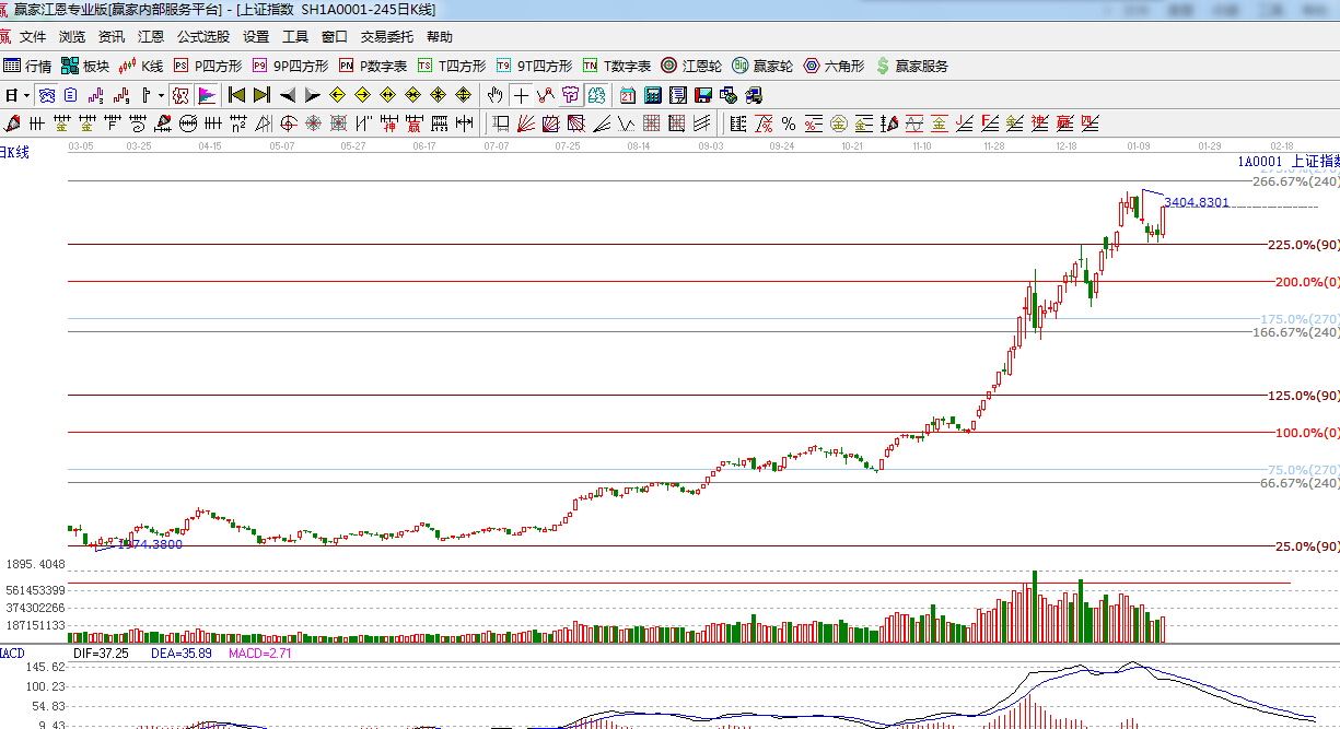 ★依據(jù)贏家江恩理論系統(tǒng)波段百分比提示:滬指在江恩90度支撐位經(jīng)過兩日縮量十字星后,如期反彈,上方阻力是240度,270度 ,3440點,3490點。