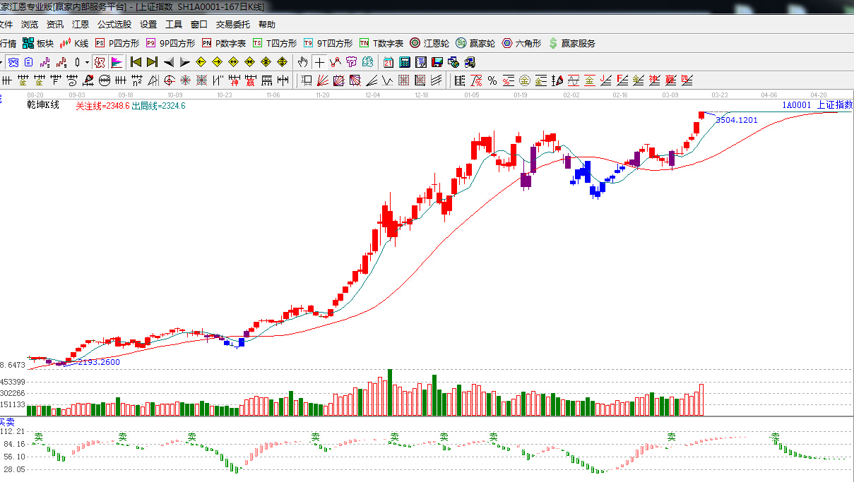 ★依據贏家江恩理論系統(tǒng)乾坤K線提示:紅色k線,可操作區(qū)域,趨勢看多。