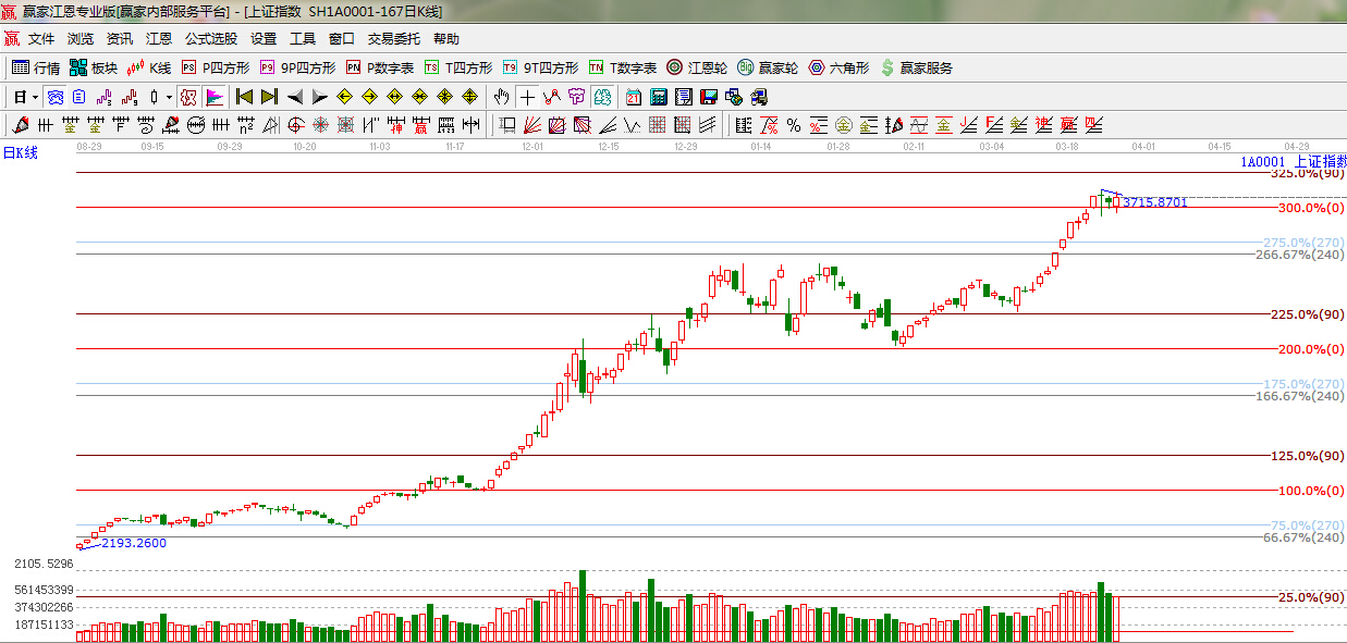 江恩看盤綜述:依據(jù)贏家江恩技術(shù)工具分析得出:今日早盤再次上攻3700,隨后震蕩小幅回落,上攻動(dòng)能稍顯乏力。創(chuàng)業(yè)板指全天大幅下挫近4%,盤面上,醫(yī)藥、白酒等防御性板塊都在大盤震蕩過(guò)程中獲得了不錯(cuò)的補(bǔ)漲機(jī)會(huì),這也從一個(gè)側(cè)面顯示了當(dāng)前市場(chǎng)存在的調(diào)整壓力,雖說(shuō)大的趨勢(shì)依然向上,但短期的調(diào)整也需謹(jǐn)慎對(duì)待。操作上,關(guān)注滯漲品種以及年報(bào)超預(yù)期的個(gè)股。