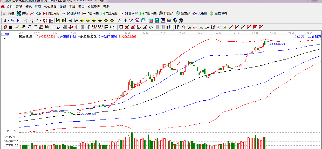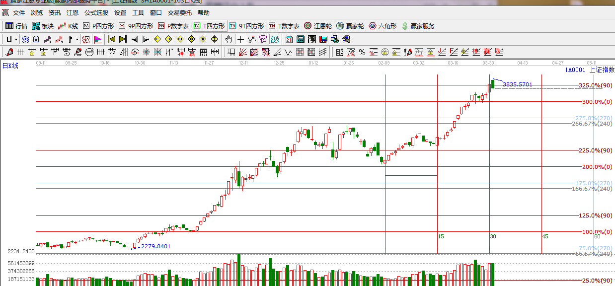 江恩看盤綜述:依據(jù)贏家江恩技術(shù)工具分析得出:今日兩市大幅高開,由于上方面臨紅色外軌線阻力,隨著權(quán)重板塊的沖高,大盤也逐步回落,由于近期市場的急漲,是資金加速涌入所推動的,目前量能持續(xù)性減弱,而且上方遇到紅色外軌阻力,預(yù)計短線大盤將圍繞3800點之下震蕩修復(fù), 操作上,繼續(xù)布局滯漲品種以及年報超預(yù)期的個股。具體可以關(guān)注大消費、環(huán)保、醫(yī)藥等年后漲幅相對落后的板塊,逢盤中急漲,要理性對待,切莫盲目追高。