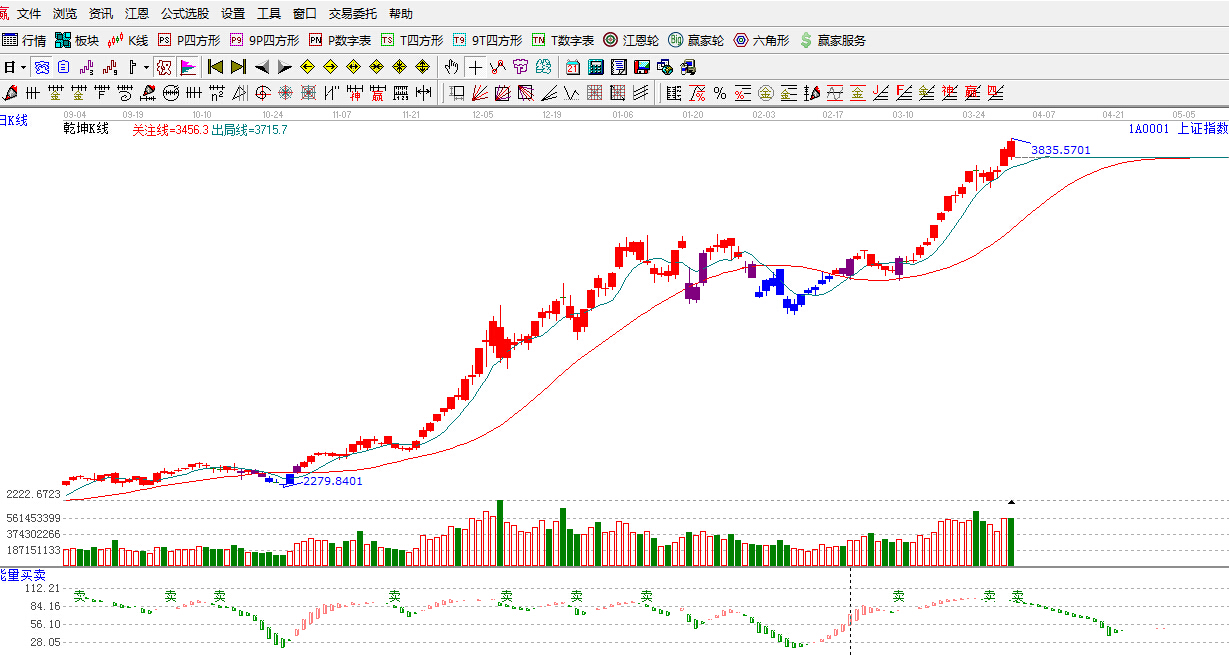 ★依據(jù)贏家江恩理論系統(tǒng)乾坤K線提示:紅色k線,綠色線上方,留意綠色短線出局線得失。