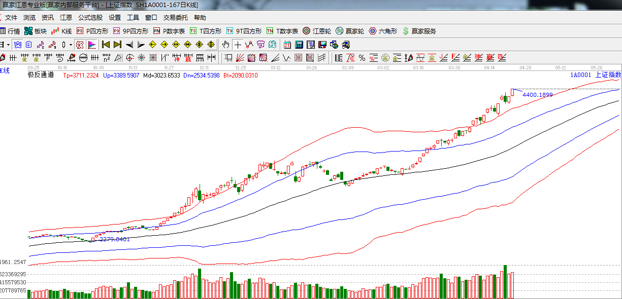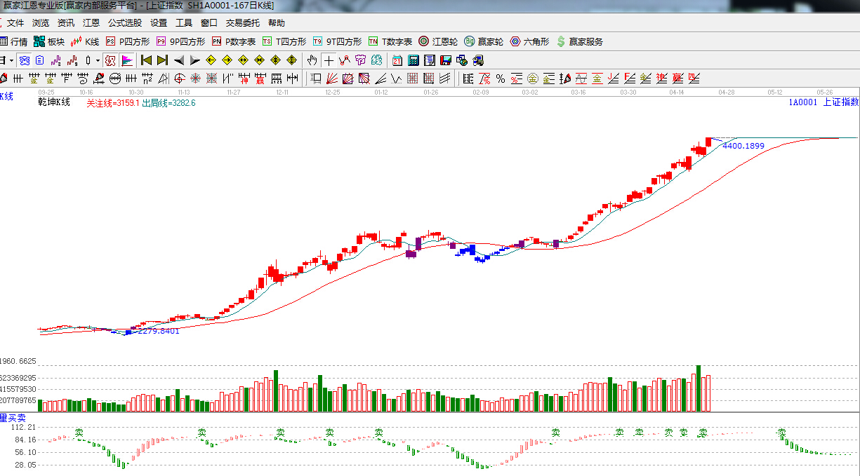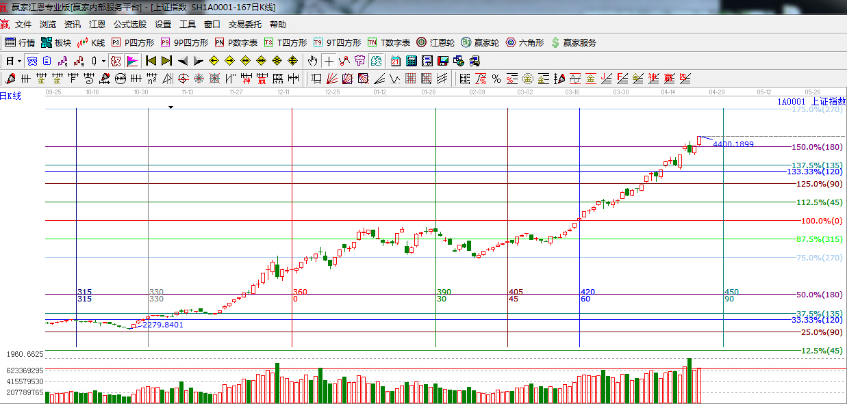 江恩看盤綜述:依據(jù)贏家江恩技術(shù)工具分析得出:周三滬深兩市小幅高開,在核電、高鐵、券商等板塊推動(dòng)下,股指大漲百點(diǎn),滬指最高報(bào)4400.19點(diǎn),整體盤面上再次上演普漲行情,依據(jù)江恩價(jià)格工具分析,江恩180度4300點(diǎn)支撐位置不破,后市有望進(jìn)入管理層預(yù)期中的慢牛格局,操作上,建議投資者利用盤中震蕩機(jī)會(huì),逢低介入近期漲勢(shì)相對(duì)落后的國(guó)資改革、業(yè)績(jī)超預(yù)期個(gè)股。