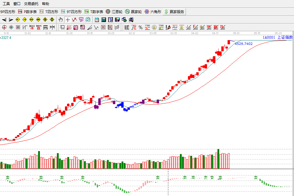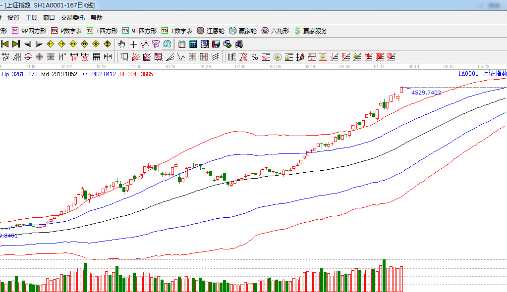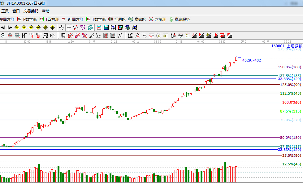 江恩看盤綜述:依據(jù)贏家江恩技術(shù)工具分析得出: 今日滬深兩市一路震蕩上行,整體來看,180度4300點支撐已被確認(rèn),指數(shù)穩(wěn)步攀升,今日滬指沖破4500點,依據(jù)規(guī)則,下一目標(biāo)位是270度4702點附近,另外,本周逢“五一”假期,防止滬指短線沖高震蕩,中線整體向好趨勢不變,操作上,繼續(xù)布局滯漲品種,尤其是最近大幅跑輸指數(shù)的潛力品種,建議重點關(guān)注受益經(jīng)濟(jì)刺激計劃,但尚未大漲的環(huán)保、水利、光伏等板塊。