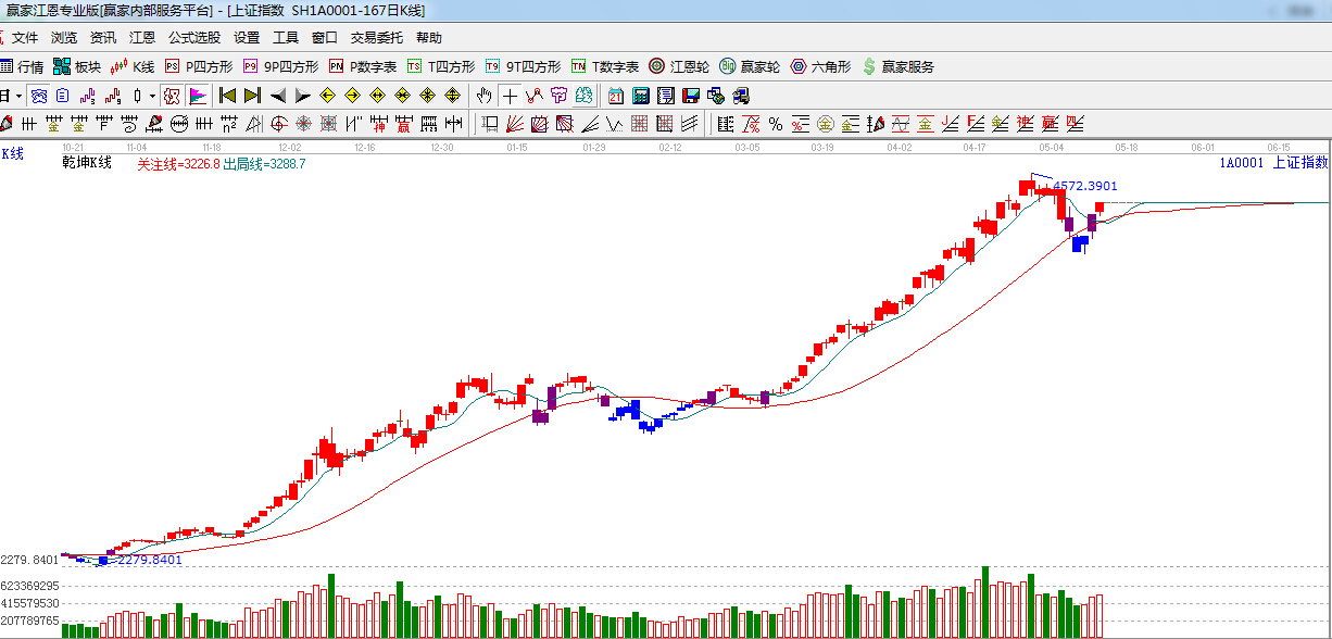 ☆依據(jù)贏家江恩理論系統(tǒng)乾坤K線提示:k線有紫色警示k線轉(zhuǎn)入紅色看多k線,短期謹(jǐn)慎看多。