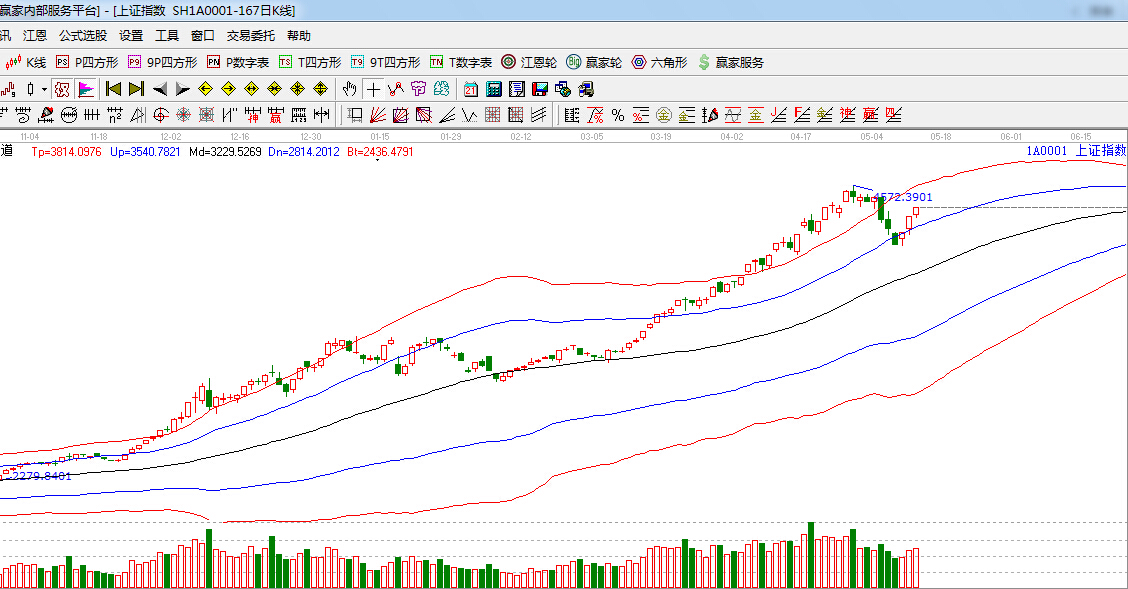 極反通道提示:滬指重新回到藍(lán)色外軌線之上,藍(lán)色外軌線轉(zhuǎn)換為支撐,趨勢(shì)看多。