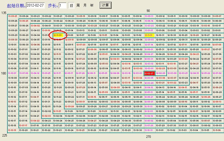 ☆依據(jù)贏家江恩系統(tǒng)工具——時(shí)間四方形提示:2012.2.27日作圖,12.11.09是其135度時(shí)間窗口。需關(guān)注這里變化。