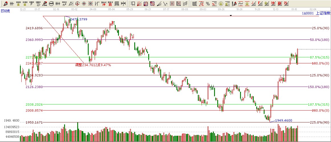 綜上所述:大盤短期315度位置2270構成短期強支撐。上方壓力180度位置2360附近。