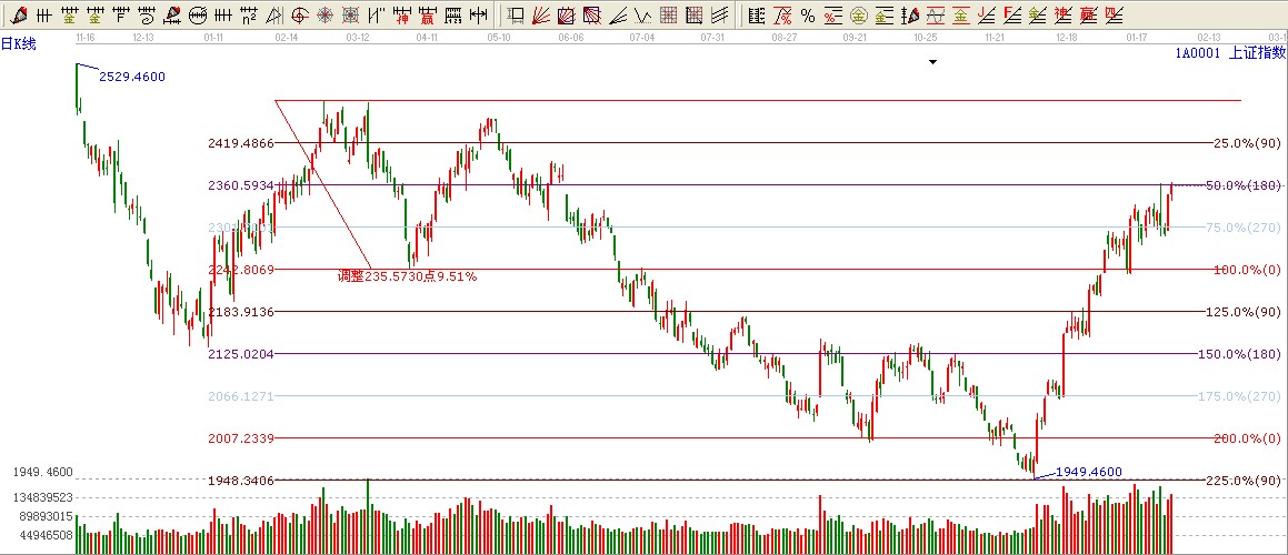 ★依據(jù)贏家波段百分比伸線提示:大盤收盤依然在180度2360壓力下方,,只要突破這里才會(huì)看高至90度位置2420附近。