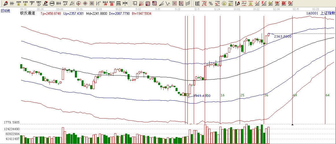 綜上所述:極反通道藍(lán)色上軌位置不破,按照極反通道應(yīng)用法則看高一線至2420附近。這里跟波段延伸線90度位置形成共振壓力。短期2330成為短期強(qiáng)支撐。