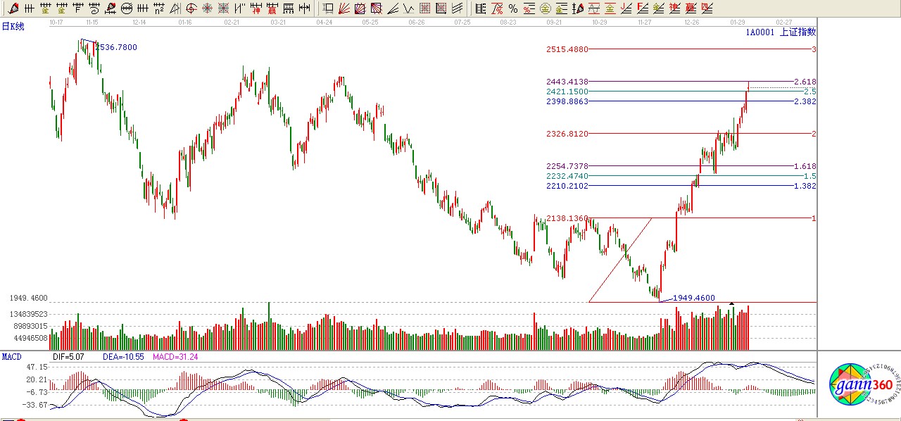 綜上所述:大盤極反通道藍(lán)色上軌位置不破,按照極反通道應(yīng)用法則看高一線至2457點(diǎn),短期黃金分割2.382位置震蕩難免。