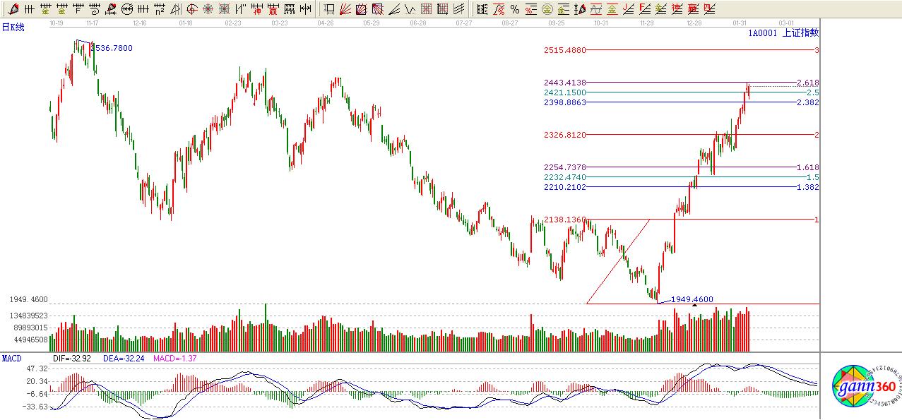 綜上所述:大盤極反通道藍(lán)色上軌位置不破,按照極反通道應(yīng)用法則看高一線至2457點(diǎn),短期黃金分割2.382/2.618位置震蕩難免。