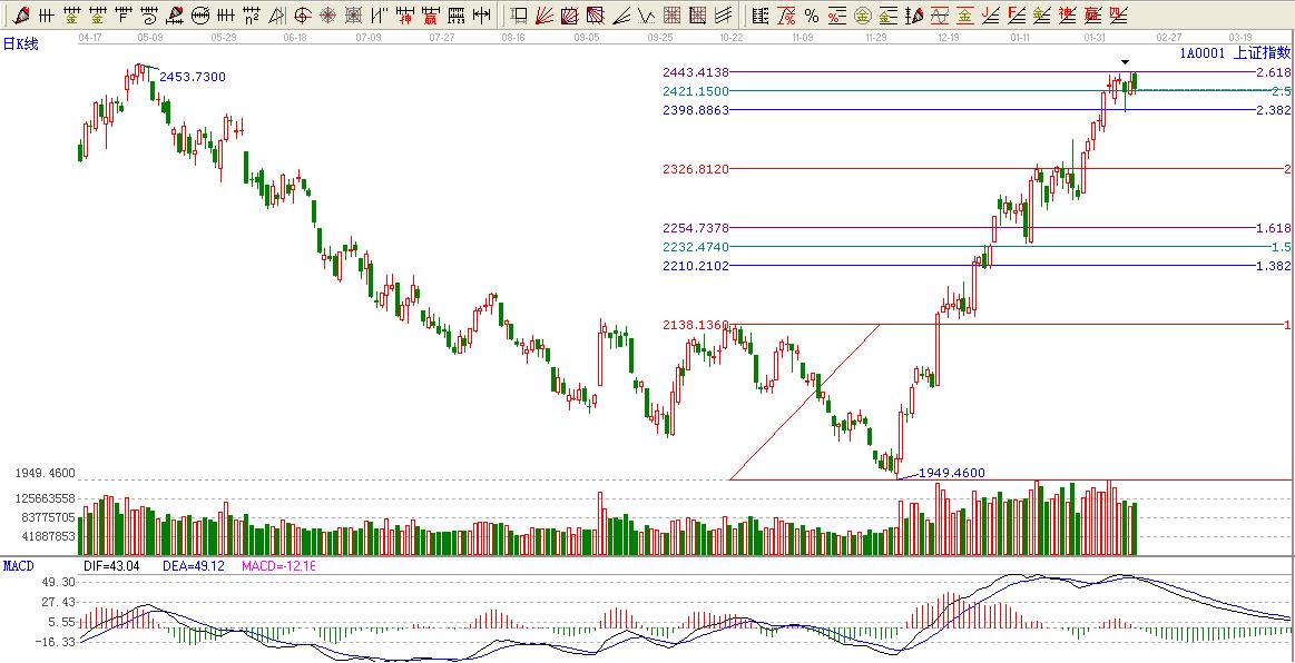 大盤(pán)如期圍繞黃金分割2.618-2.382位置震蕩,也再一次滲透了黃金分割在金融市場(chǎng)一個(gè)不可忽視的細(xì)節(jié)問(wèn)題。盤(pán)面大盤(pán)高開(kāi)后震蕩走低,個(gè)股較為活躍截止收盤(pán)大盤(pán)跌10.84點(diǎn)跌幅0.45%,漲停家數(shù)29家,跌幅5個(gè)點(diǎn)以上的15家。引人注目的就年前復(fù)盤(pán)的10家st股票4家漲停4家跌停,可謂是雷厲風(fēng)行。
