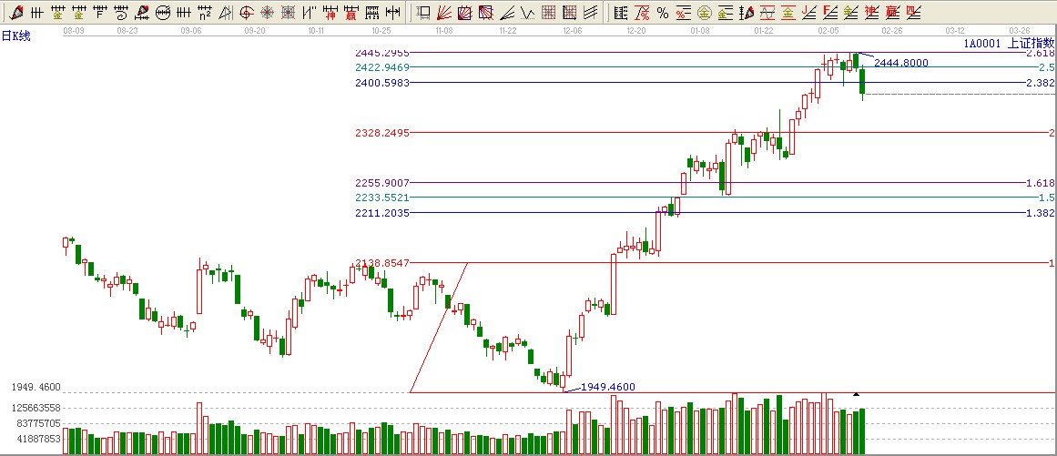 ☆依據(jù)贏家黃金價(jià)格延伸線提示:大盤失手黃金分割2.382的位置2400,這里構(gòu)成短期壓力,跌破一線看低一線至2倍位置2328點(diǎn)附近