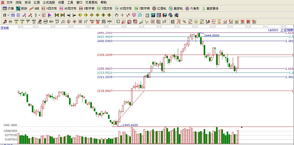 ★依據(jù)贏黃金價格延伸線提示:目前大盤出于黃金分割2倍位置2328附近下方,這里跟極反通道生命線構(gòu)成了雙重壓力位置。這里不過謹(jǐn)慎大盤再一次回落。