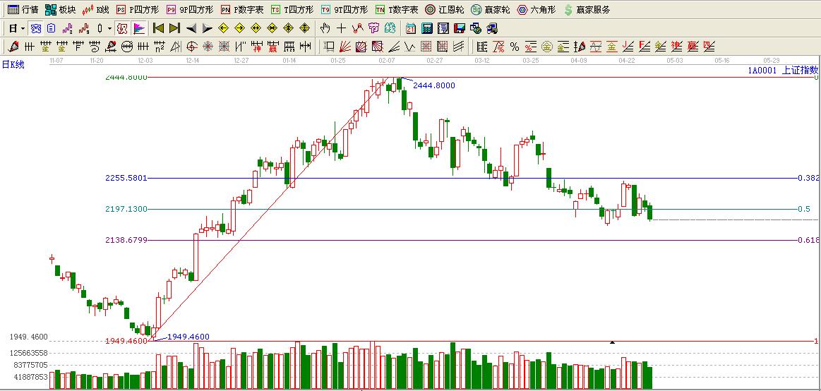 綜上所述:大盤圍繞黃金分割0.5位置反復(fù)震蕩,短期再度考驗(yàn)2165.78點(diǎn)支撐,一旦支撐有效,大盤再次上行。