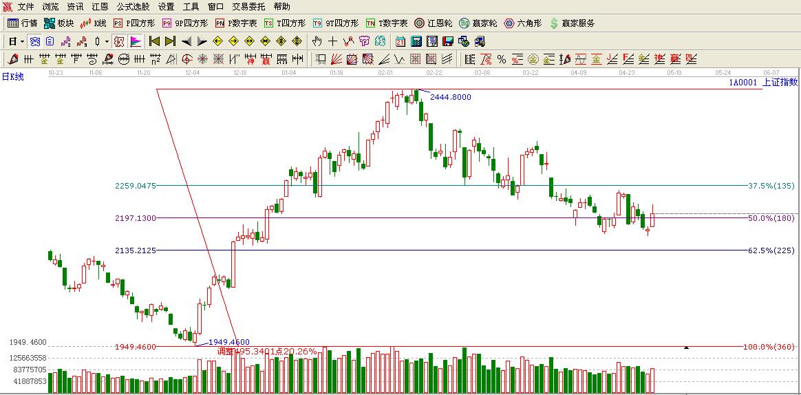 ☆依據(jù)江恩波段百分比提示:大盤(pán)如期構(gòu)筑小雙底再度運(yùn)行在其180度位置2197點(diǎn)上方,按照規(guī)則這里不破有望挑戰(zhàn)135度位置2259點(diǎn)高點(diǎn)。