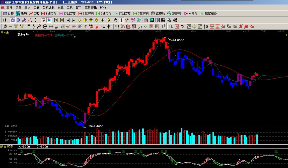 ★依據(jù)贏家乾坤k線提示:出局線上穿關(guān)注線K線為紅色,收盤不破關(guān)注線看多,如圖(1);