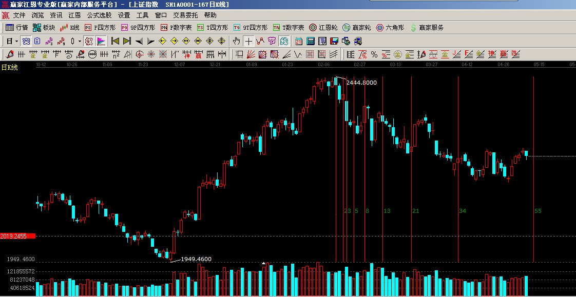 ☆依據(jù)費(fèi)氏時(shí)間周期線提示:以2444點(diǎn)時(shí)間為起點(diǎn)做圖如圖(3),5月13號(hào)為時(shí)間窗;