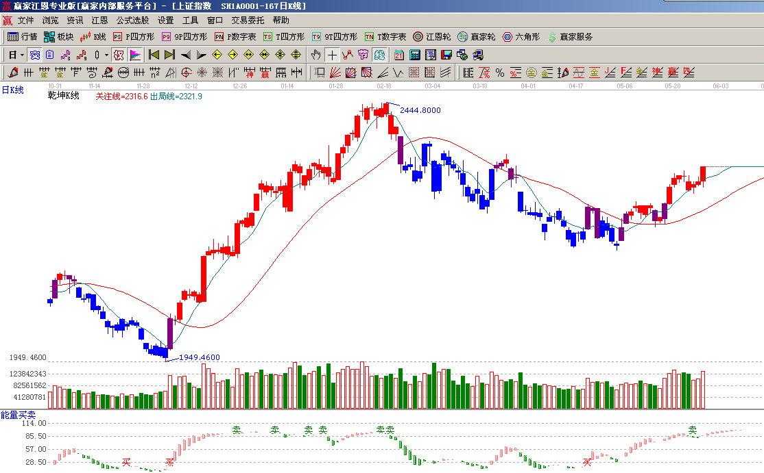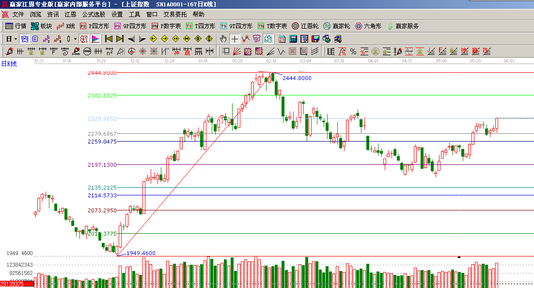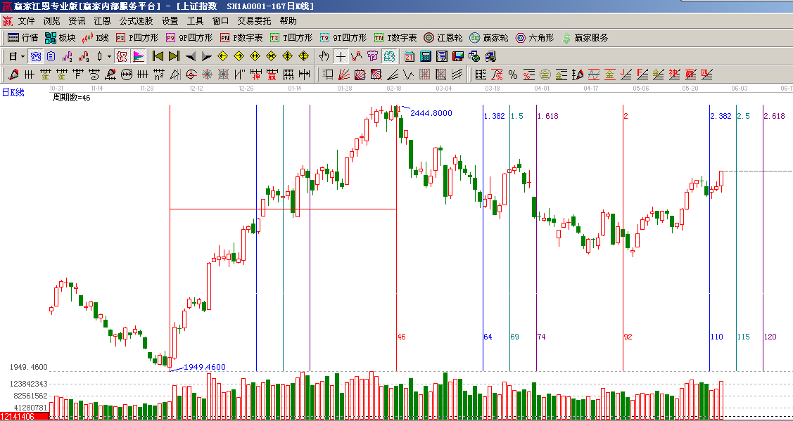☆依據(jù)贏家江恩系統(tǒng)黃金時(shí)間周期線提示:從1949點(diǎn)至2444點(diǎn)做時(shí)間圖(3),5月31號(hào)為時(shí)間窗;