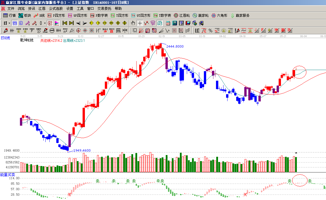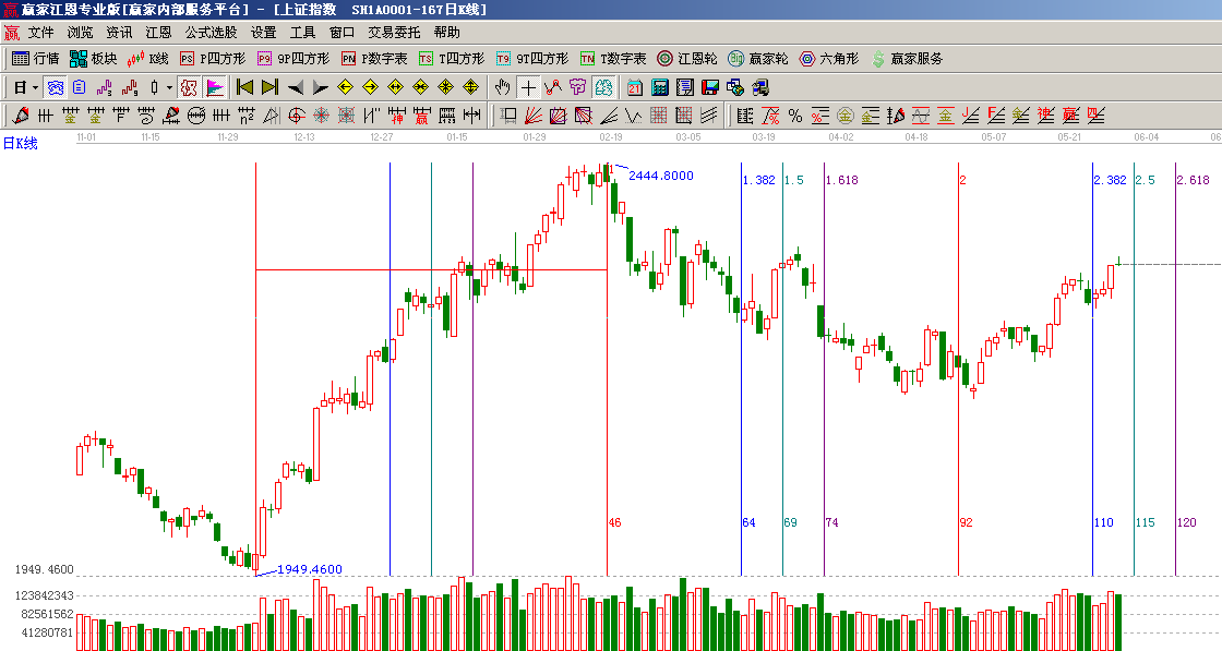 ☆依據(jù)贏家江恩系統(tǒng)黃金時(shí)間周期線提示:從1949點(diǎn)至2444點(diǎn)做時(shí)間圖(3),5月31號(hào)為時(shí)間窗;