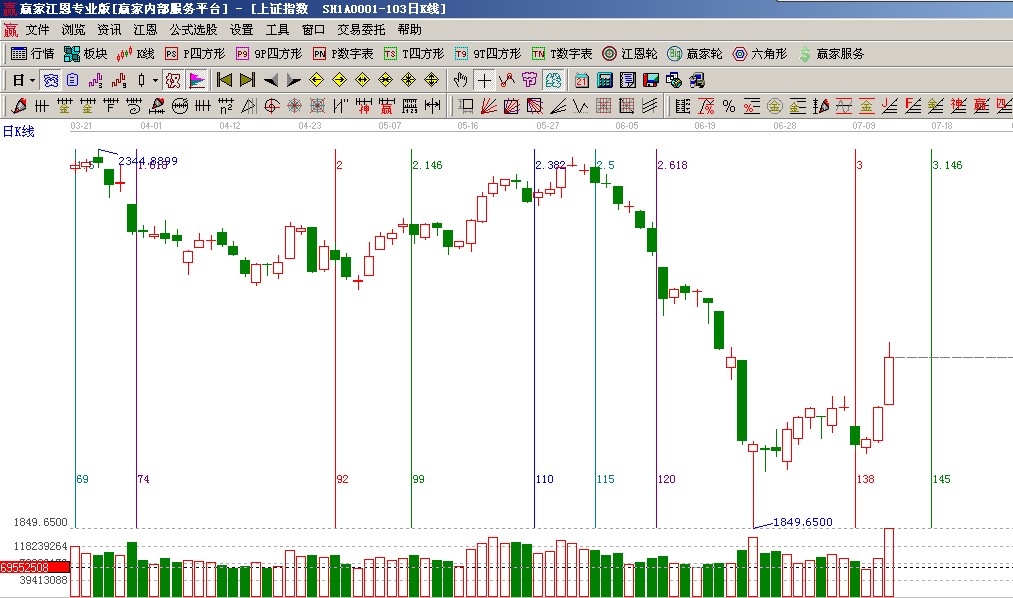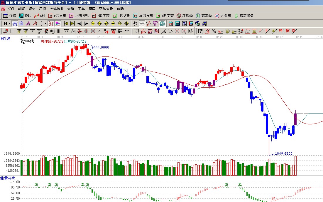 ☆依據(jù)贏家江恩系統(tǒng)乾坤K線提示: K線收盤高于關(guān)注線變成紫色,藍(lán)轉(zhuǎn)紫從此工具判斷為警示信號變紅則看多;(1)