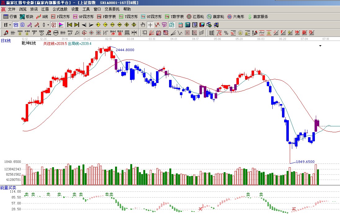 ☆依據(jù)贏家江恩系統(tǒng)乾坤K線提示: 紫色為警示信號,變紅則看多,近期還需關(guān)注金叉是否能形成;(1)