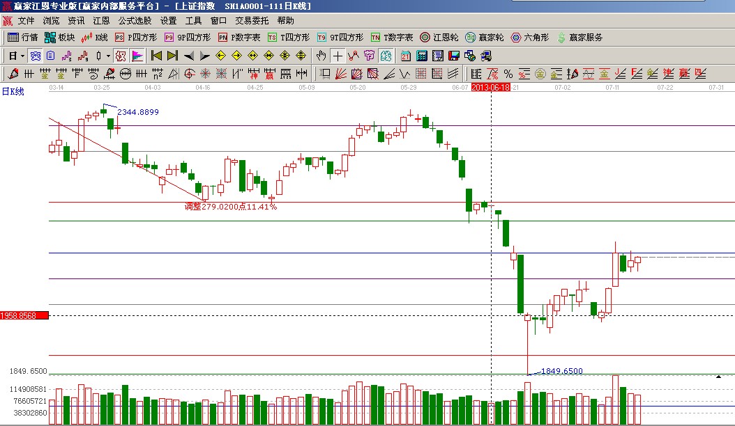 指數(shù)小幅低開(kāi)盤(pán)中下探至短周期15分鐘生命線后在軍工、高鐵等板塊的拉升下回補(bǔ)缺口翻紅,板塊方面概念類如3D打印、智能電網(wǎng)、LED、以及持續(xù)看好并操作的光伏板塊表現(xiàn)突出;技術(shù)面市場(chǎng)近三天在百分比2025-2072區(qū)間震蕩,短周期面臨方向的選擇,同時(shí)明天17號(hào)時(shí)間窗我們?cè)谇捌诘拇髣?shì)分析中一直提示,結(jié)合目前量?jī)r(jià)運(yùn)行關(guān)系市場(chǎng)延續(xù)上攻的概率較大,策略上百分比與短周期極反通道生命線構(gòu)成的區(qū)域不破持股為主,上方拋壓區(qū)為6月中旬平臺(tái)與日線生命線位置;