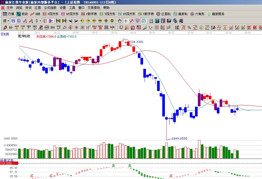☆依據(jù)贏家江恩系統(tǒng)乾坤K線提示: 出局線與關(guān)注線空頭形成,藍(lán)色K線代表休息區(qū),等待信號的轉(zhuǎn)變;(1)