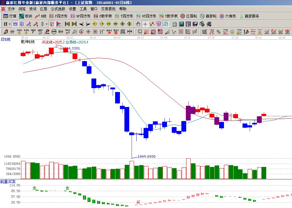★依據(jù)贏家江恩系統(tǒng)乾坤K線提示: 紫色K線轉為紅色進入可操作區(qū),出局線與關注線形成金叉操作性更安全;(1)