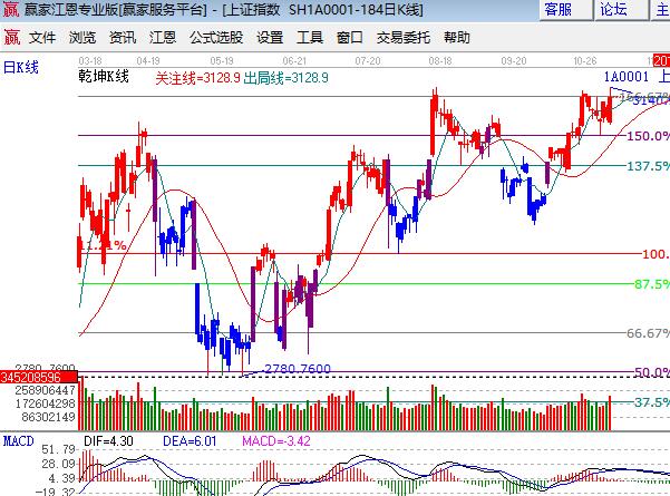 大盤低開高走強勢反彈上漲0.84%,滬指盤中創(chuàng)出10個月新高,創(chuàng)業(yè)板最弱漲幅也達0.32%。大金融板塊券商和保險領(lǐng)漲權(quán)重,石油、有色漲幅墊后;題材方面中字頭為主的一帶一路,債轉(zhuǎn)股和PPP概念領(lǐng)漲,次新、股權(quán)轉(zhuǎn)讓、高送轉(zhuǎn)預期股早盤集體上攻,但尾盤再度集體跳水走出沖高回落局勢,黃金領(lǐng)跌。個股上漲居多成交量放大。技術(shù)方面,滬指各周期站在生命線上,短周期還有一定上升勢頭,妖股已進入收割期,關(guān)注低位趨勢即將突破補漲類個股,日線走勢按照極反通道指引來進行策略的調(diào)整,波段倉5成保持不變,短線3140-3160區(qū)間是江恩百分比和藍色外軌線位置,周四在3090加的籌碼在短線阻力區(qū)拋售,3111、3100為日內(nèi)支撐,3140、3149為日內(nèi)阻力,僅供參考,不構(gòu)成任何投資建議。