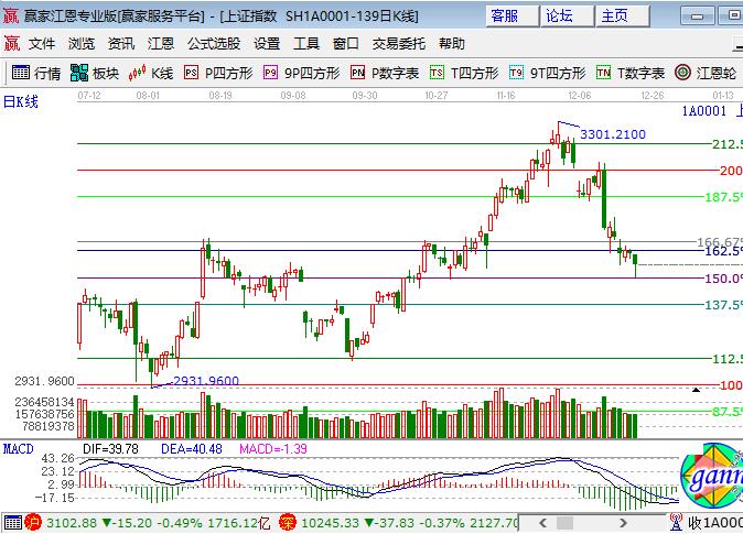 周二大盤低開一路下探至江恩百分比180度及半年線位置,尾盤權(quán)重股拉抬跌幅收窄,創(chuàng)業(yè)板勉強收紅。板塊方面,券商微漲,石油、銀行、保險調(diào)整拖累指數(shù),二線藍籌表現(xiàn)不佳;熱點題材混亂,小部分次新、科技股超跌反彈,短股橫行,上海國改、油改、農(nóng)業(yè)零跌,個股漲跌互現(xiàn)成交量同前日持平。技術(shù)方面,今日是大盤日線時間窗,江恩百分比180度3084點止跌回升,短周期底背離明確,此處預(yù)計展開反抽,力度能回補缺口就相當不錯了,反彈結(jié)束預(yù)計市場還延續(xù)下探,因此操作上反彈中結(jié)合所持個股情況,決定是否加的1成波段倉出掉,等待二次加倉信號,3090、3080為日內(nèi)支撐,3121、3135為日內(nèi)阻力,僅供參考,不構(gòu)成任何投資建議。