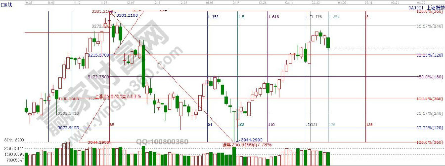 ☆依據(jù)贏家江恩理論系統(tǒng)江恩波段百分比線提示:依據(jù)百分比分析阻力位是3272點(diǎn)附近,阻力位3243點(diǎn)?;芈湎路街味叹€3222點(diǎn),日線120度置3215點(diǎn)附近。