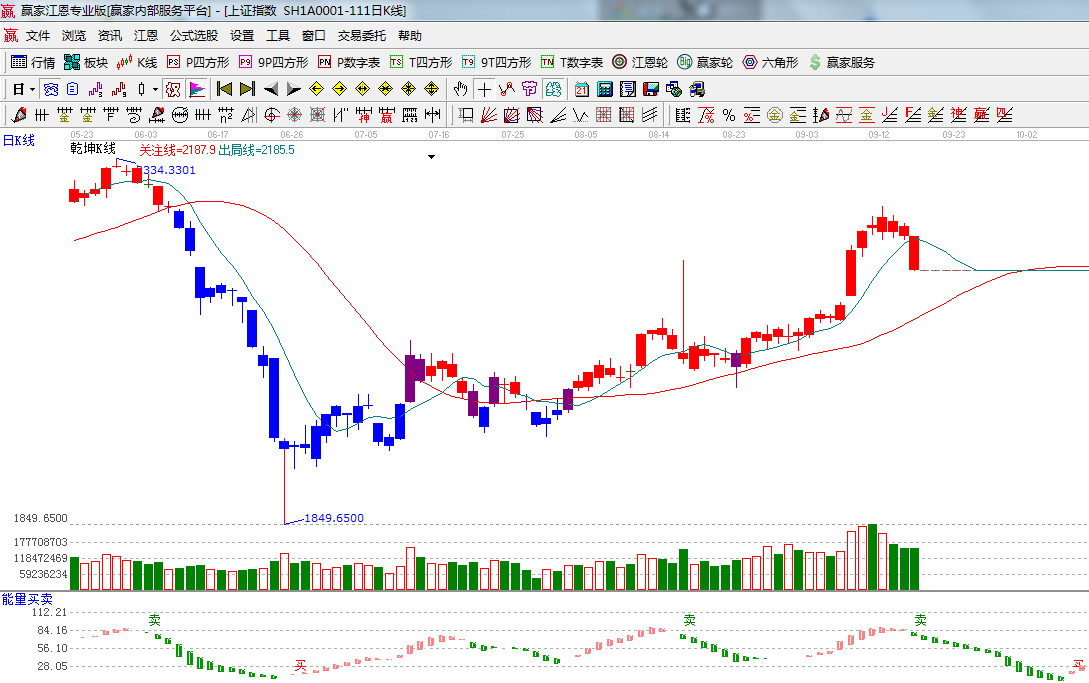★依據(jù)贏家江恩系統(tǒng)乾坤K線提示:出局線如期跌破,關(guān)注線將慢慢上移展開(kāi)反抽;(1)