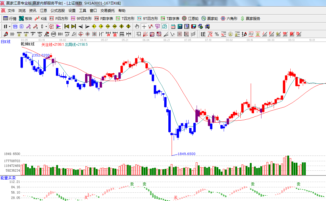 ★依據(jù)贏家江恩系統(tǒng)乾坤K線提示: 短期出局線壓制,關(guān)注線上移,兩線粘合是市場(chǎng)有望轉(zhuǎn)入震蕩;
