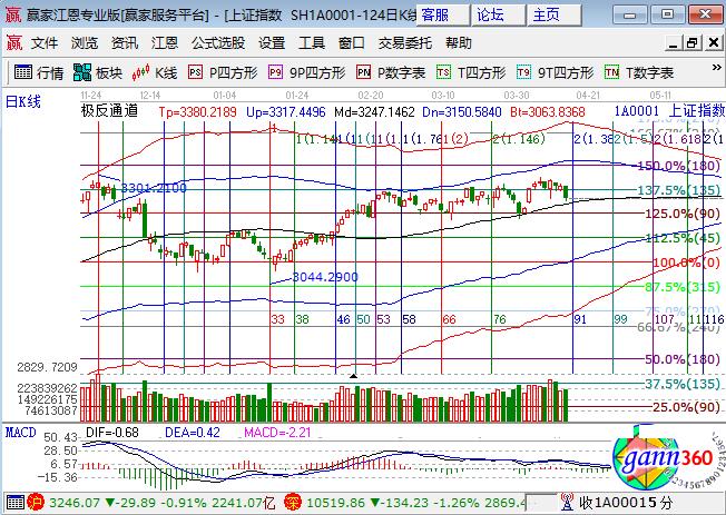 大盤上周五低開低走中陰殺跌0.91%,深成指和中小創(chuàng)大跌1%以上,創(chuàng)業(yè)板創(chuàng)近期新低。板塊方面,兩市僅船舶板塊收紅,煤炭有色、石油、銀行相對(duì)抗跌;盤面無熱點(diǎn),黃金、高送轉(zhuǎn)盤中有表現(xiàn)但力度有限,粵港澳、雄安新區(qū)、一帶一路概念領(lǐng)跌,個(gè)股下跌居多。技術(shù)方面,日線收盤跌破贏家江恩百分比135度位置,下方極反通道生命線、江恩百分比90度為下方支撐帶,點(diǎn)位分別是3233、3210點(diǎn),短周期均運(yùn)行在生命線以下弱勢(shì)通道,操作頻率降低,注意觀察支撐帶支撐有效性,波段4成倉位,短線3成倉;3223、3210為日內(nèi)支撐,3255、3263為日內(nèi)阻力,僅供參考,不構(gòu)成任何投資建議。