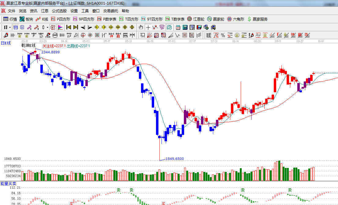 ★依據(jù)贏家江恩系統(tǒng)能量買賣提示:紅色柱子逐漸加長,多方占優(yōu);