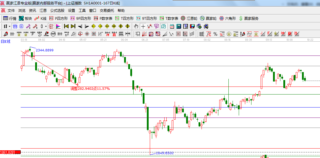 指數(shù)延續(xù)下跌趨勢以小陰線報收,綜合當前各方面因素可得出預判市場的調整將是以緩跌開展,短周期15分鐘再下探將會形成背離,仍以盤中反抽方式修復指標,長周期周線判斷生命線位置是2150附近,這區(qū)域也是日線生命線的位置,政策方面十八屆三中全會將于下個月上旬召開,一些政策支持將帶動板塊的輪翻上攻熱點不會缺失;時間方面注意下周三時間窗口與極反通道的關系;