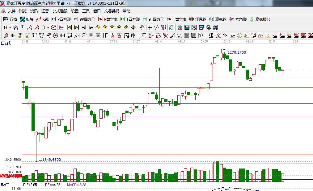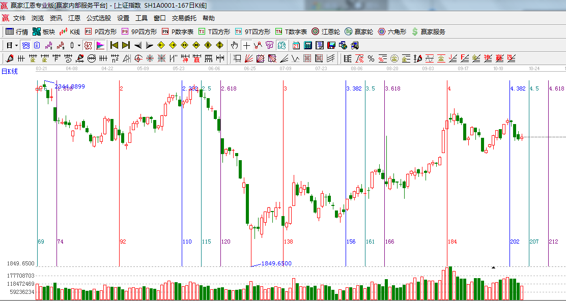 ☆依據(jù)贏家江恩系統(tǒng)波段百分比延伸提示:零度位置2160是下方百分比線;