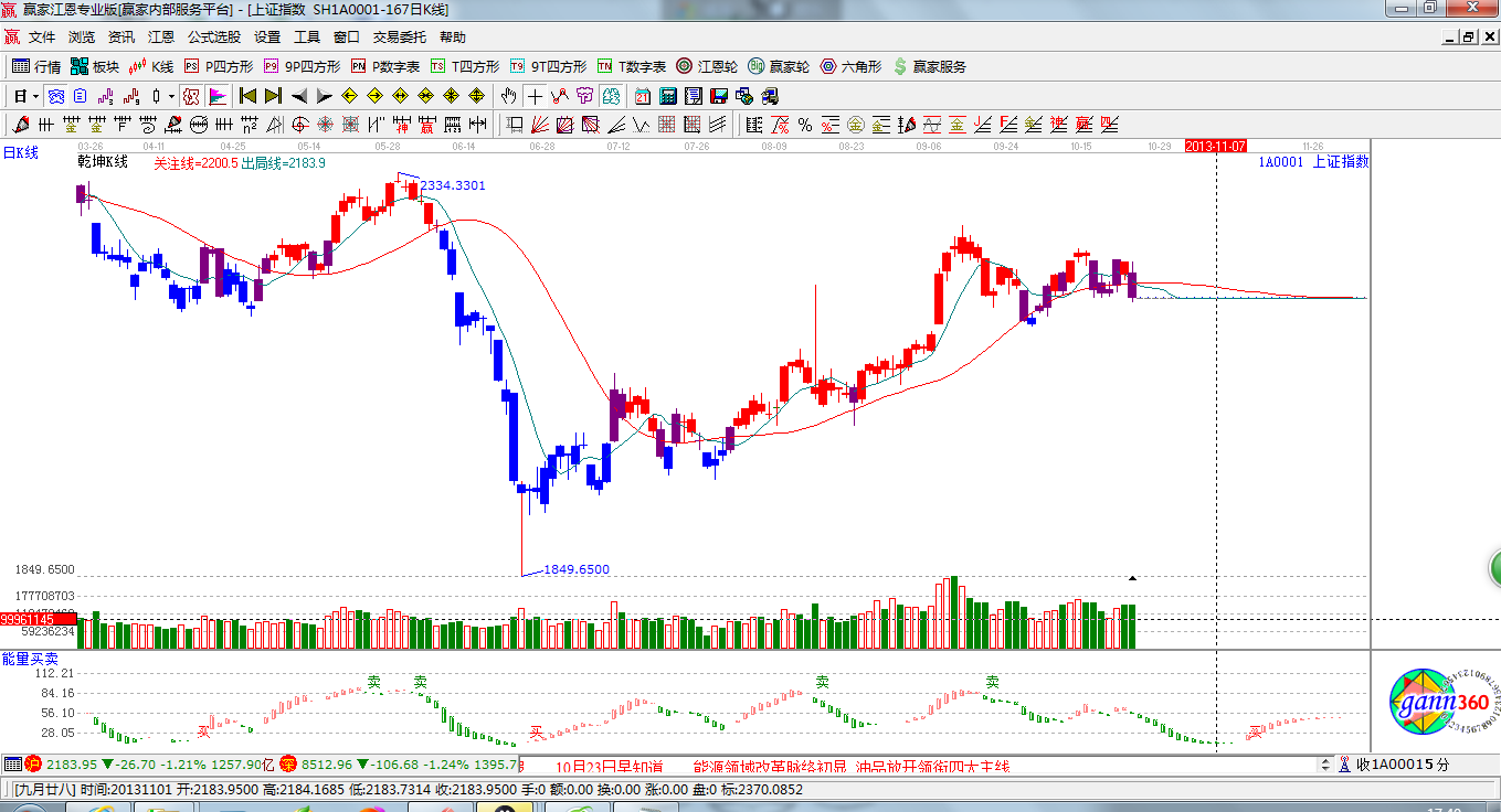 ★依據(jù)贏家江恩系統(tǒng)乾坤K線提示: 紫色K線出現(xiàn),等待趨勢明確,轉(zhuǎn)綠則進入休息;