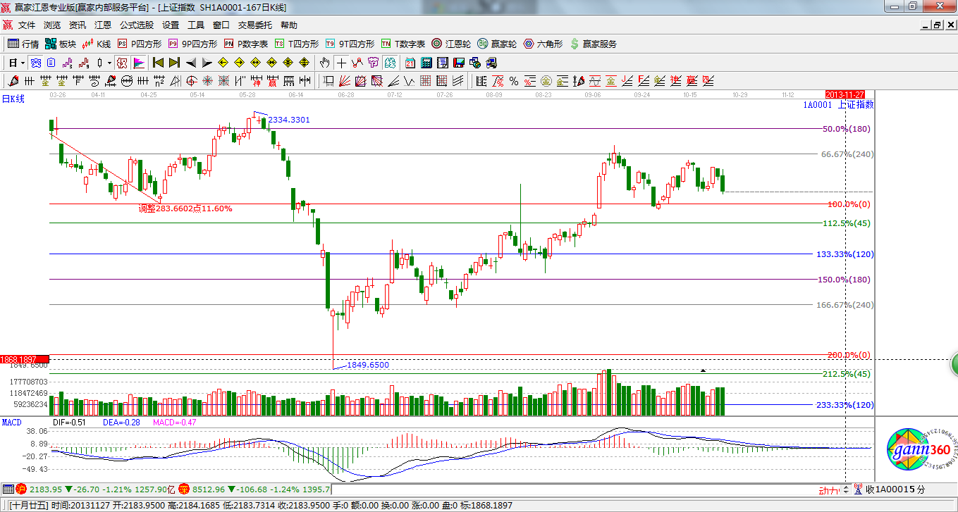 ☆依據(jù)贏家江恩系統(tǒng)波段百分比延伸提示:江恩百分比0度是2160;