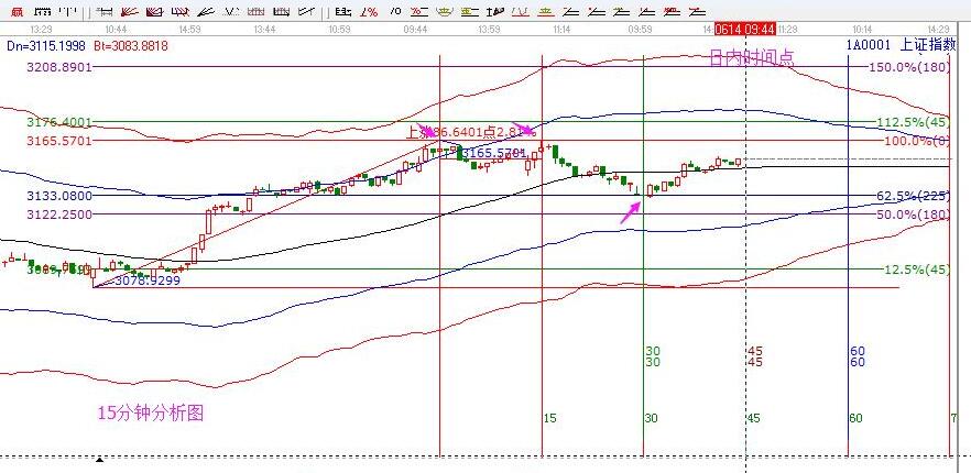 昨日分析及走勢:昨日早盤分析中,給出的支撐是3120,壓力是3155點,日內(nèi)時間10點。實際走勢為:最高3155點,一點不差,日內(nèi)時間10點在3131止跌起漲,沒有完全回踩到預(yù)期的支撐,但時間為先,對照下方15分鐘圖和30分鐘圖,可以清晰的看到昨天市場的運行軌跡。以前分享過這個經(jīng)驗,再說明一次:以兩個高點做等距周期,按照經(jīng)驗對應(yīng)的下個時間見低點概率大,昨天的走勢再次驗證了此成功率。15分鐘和30分鐘小雙頭預(yù)測了昨天的低點時間,大盤個股都通用,有心的朋友可以結(jié)合自己的股票試試奧。大盤生命線附近震蕩鞏固,僅作短線回調(diào)對待,3016和3022雙針引發(fā)的上漲遠(yuǎn)未結(jié)束,所以按照自己的策略執(zhí)行交易即可。