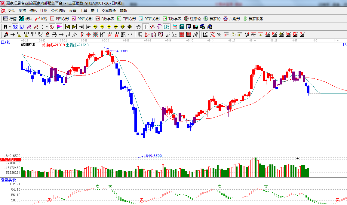 ☆依據(jù)贏家江恩系統(tǒng)乾坤K線提示: 紫色多空轉(zhuǎn)換位置轉(zhuǎn)為藍色做空休息區(qū);
