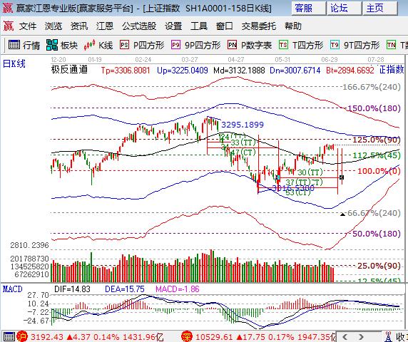 上周五大盤(pán)低開(kāi)高走縮量小漲0.14%,創(chuàng)業(yè)板指領(lǐng)漲但漲幅有限,相對(duì)于外盤(pán)大跌氛圍還算堅(jiān)挺。板塊方面,保險(xiǎn)、銀行勉強(qiáng)跑贏大盤(pán),地產(chǎn)、煤炭、鋼鐵和券商等小跌;題材方面,冷新、鋰電和中報(bào)業(yè)績(jī)預(yù)增概念局部表現(xiàn),雄安、粵港澳和人工智能領(lǐng)跌,兩市上漲家數(shù)略多,成交量持續(xù)萎縮。技術(shù)方面,日線(xiàn)懸空在極反通道生命線(xiàn)和外軌線(xiàn)位置震蕩,震蕩區(qū)間在江恩百分比45度、90度震蕩,對(duì)應(yīng)的點(diǎn)位分析是3154點(diǎn)、3212點(diǎn),短周期15、30、60全部重回生命線(xiàn)上方,保持6月9號(hào)觀點(diǎn),波段趨勢(shì)震蕩賂外軌線(xiàn)上攻,操作策略保持短線(xiàn)、波段結(jié)合不變,倉(cāng)位保持在5-7成,3182、3172為日內(nèi)支撐,3209、3218為日內(nèi)阻力,僅供參考,不構(gòu)成任何投資建議。