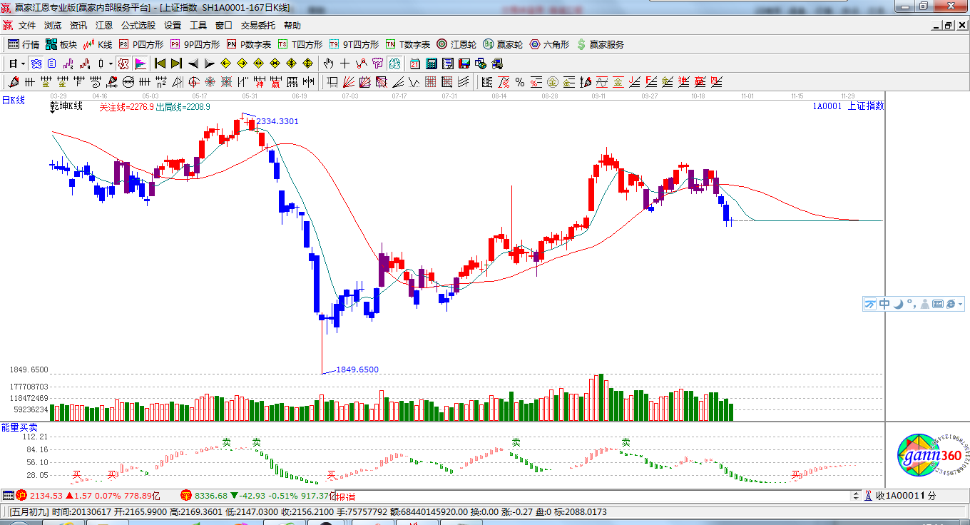 ☆依據(jù)贏家江恩系統(tǒng)乾坤K線提示: 藍(lán)色休息區(qū)以保守或空倉(cāng)為主;